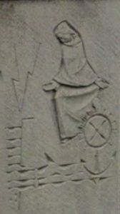Le crucifix, plus ancien et sans doute d’origine, se dresse sur la base plus moderne. Un bas-relief y représente la Vierge veillant sur le barrage, l’écluse et la centrale électrique, ainsi que sur les bateliers (ancre et barre) et les agriculteurs (charrue).