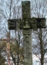 Sur la croix sont sculptés une gerbe de blé, une grappe de raisin, ainsi que les emblèmes du prêtre : le calice et l’étole.